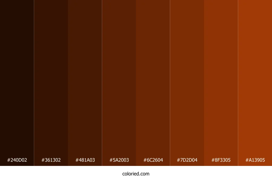 ![]() | #240D02 | 36, 13, 2 | 19, 89%, 7% | 0%, 64%, 94%, 86% | oklch(0.192 0.045 49) |