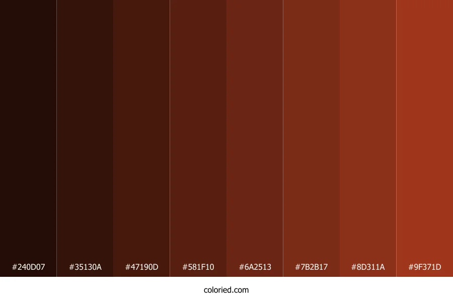 | #581F10 | 88, 31, 16 | 13, 69%, 20% | 0%, 65%, 82%, 65% | oklch(0.324 0.088 36) | |