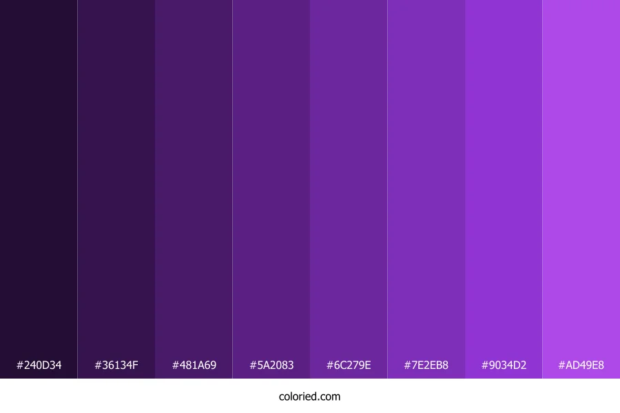![]() | #240D34 | 36, 13, 52 | 275, 60%, 13% | 31%, 75%, 0%, 80% | oklch(0.218 0.075 309) |