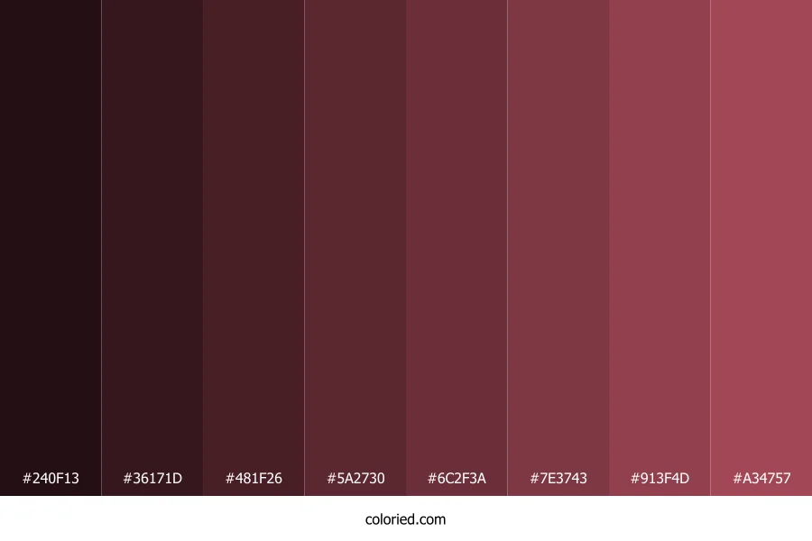 ![]() | #240F13 | 36, 15, 19 | 349, 41%, 10% | 0%, 58%, 47%, 86% | oklch(0.201 0.036 9) |