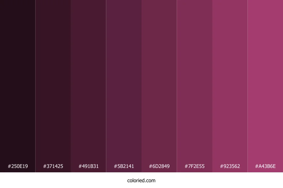 ![]() | #250E19 | 37, 14, 25 | 331, 45%, 10% | 0%, 62%, 32%, 85% | oklch(0.204 0.042 351) |