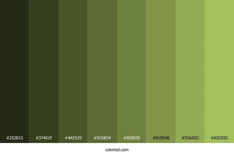 | #5C6B34 | 92, 107, 52 | 76, 35%, 31% | 14%, 0%, 51%, 58% | oklch(0.502 0.081 122) | |
