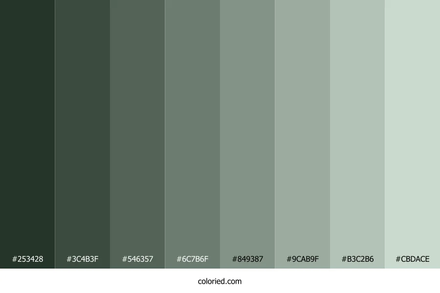 ![]() | #253428 | 37, 52, 40 | 132, 17%, 17% | 29%, 0%, 23%, 80% | oklch(0.307 0.029 151) |