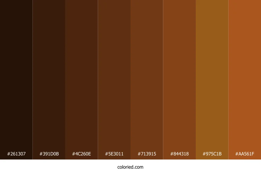 ![]() | #261307 | 38, 19, 7 | 23, 69%, 9% | 0%, 50%, 82%, 85% | oklch(0.211 0.038 52) |
