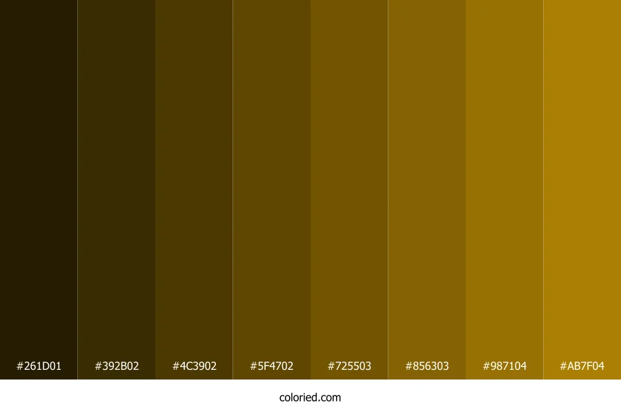 ![]() | #261D01 | 38, 29, 1 | 45, 95%, 8% | 0%, 24%, 97%, 85% | oklch(0.235 0.046 92) |