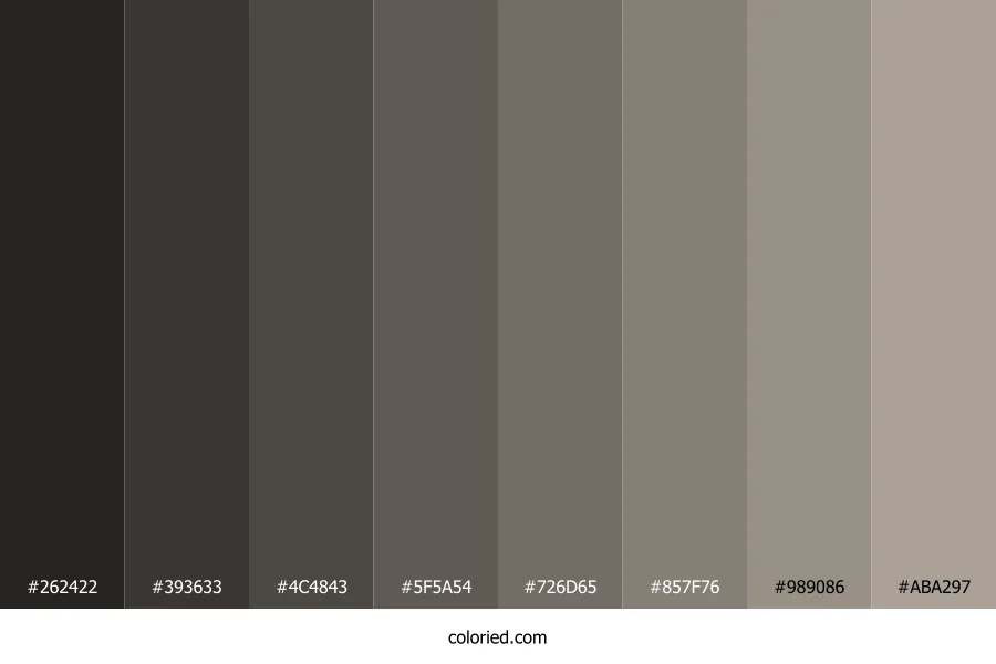 ![]() | #262422 | 38, 36, 34 | 30, 6%, 14% | 0%, 5%, 11%, 85% | oklch(0.262 0.005 68) |