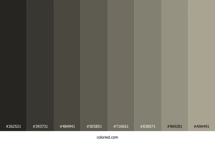 | #5E5B51 | 94, 91, 81 | 46, 7%, 34% | 0%, 3%, 14%, 63% | oklch(0.471 0.016 93) | |