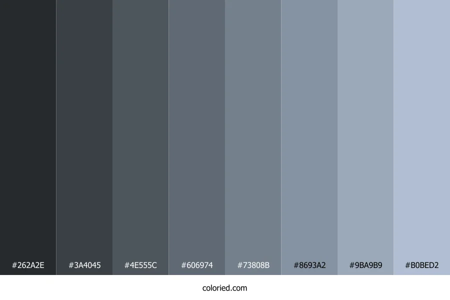 | #9BA9B9 | 155, 169, 185 | 212, 18%, 67% | 16%, 9%, 0%, 27% | oklch(0.729 0.028 252) | |