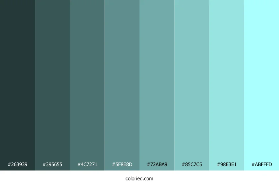 ![]() | #263939 | 38, 57, 57 | 180, 20%, 19% | 33%, 0%, 0%, 78% | oklch(0.328 0.024 196) |