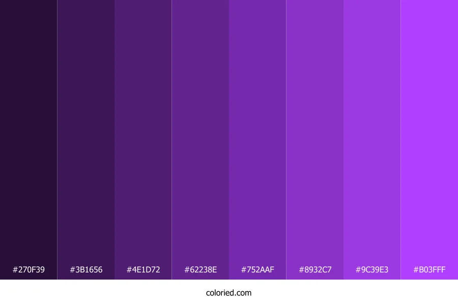 ![]() | #270F39 | 39, 15, 57 | 274, 58%, 14% | 32%, 74%, 0%, 78% | oklch(0.230 0.080 308) |
