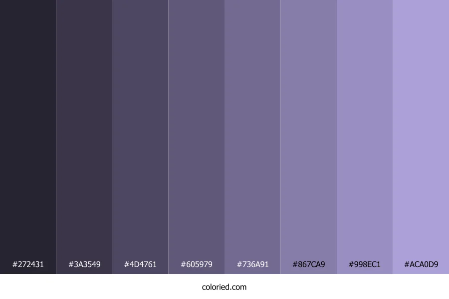 | #998EC1 | 153, 142, 193 | 253, 29%, 66% | 21%, 26%, 0%, 24% | oklch(0.675 0.075 294) | |