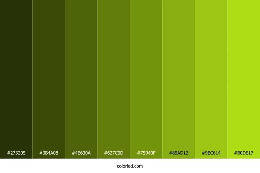 | #627C0D | 98, 124, 13 | 74, 81%, 27% | 21%, 0%, 90%, 51% | oklch(0.546 0.130 123) | |