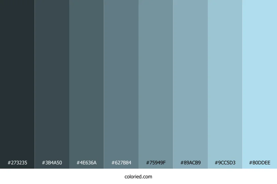 ![]() | #273235 | 39, 50, 53 | 193, 15%, 18% | 26%, 6%, 0%, 79% | oklch(0.308 0.016 216) |