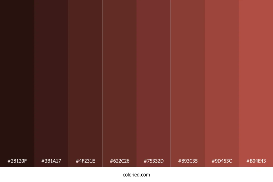 ![]() | #28120F | 40, 18, 15 | 7, 45%, 11% | 0%, 55%, 62%, 84% | oklch(0.214 0.037 29) |