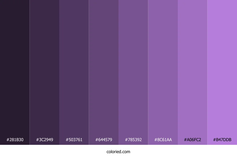 ![]() | #281B30 | 40, 27, 48 | 277, 28%, 15% | 17%, 44%, 0%, 81% | oklch(0.248 0.043 312) |