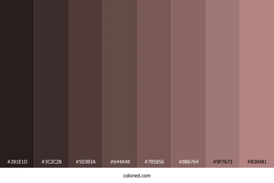 | #8B6764 | 139, 103, 100 | 5, 16%, 47% | 0%, 26%, 28%, 45% | oklch(0.549 0.047 24) | |