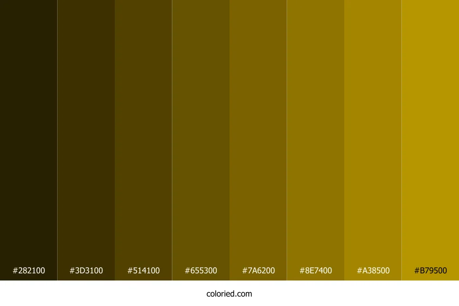 | #7A6200 | 122, 98, 0 | 48, 100%, 24% | 0%, 20%, 100%, 52% | oklch(0.505 0.103 92) | |