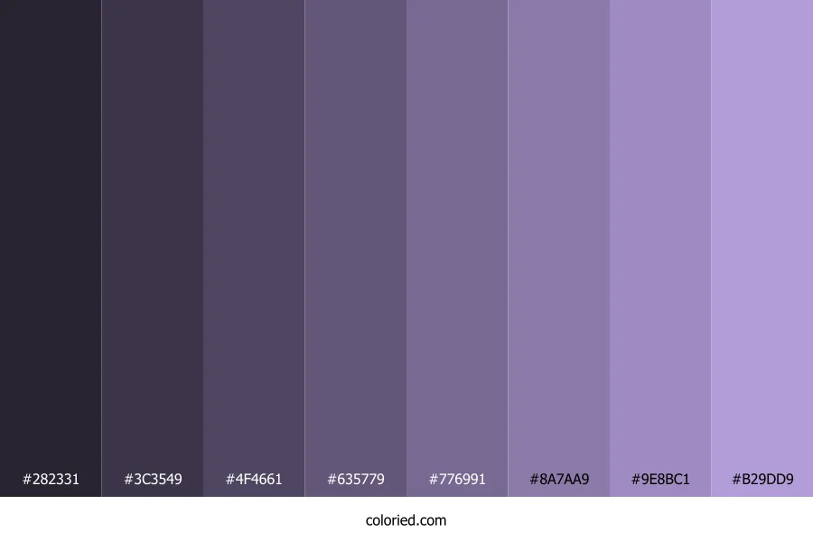 | #B29DD9 | 178, 157, 217 | 261, 44%, 73% | 18%, 28%, 0%, 15% | oklch(0.736 0.088 300) |
