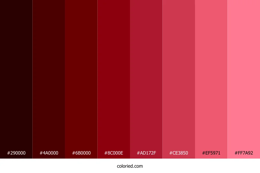 ![]() | #290000 | 41, 0, 0 | 0, 100%, 8% | 0%, 100%, 100%, 84% | oklch(0.176 0.072 29) |
