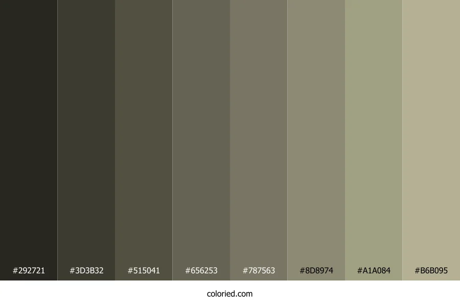 | #8D8974 | 141, 137, 116 | 50, 10%, 50% | 0%, 3%, 18%, 45% | oklch(0.628 0.031 98) | |
