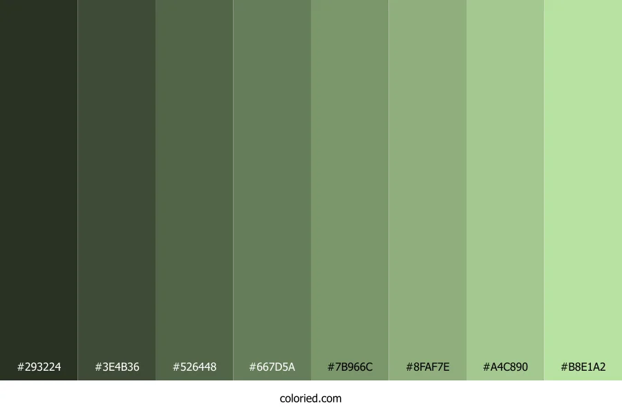 ![]() | #293224 | 41, 50, 36 | 99, 16%, 17% | 18%, 0%, 28%, 80% | oklch(0.304 0.027 135) |