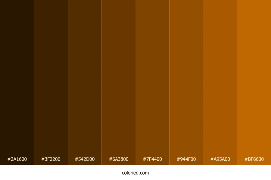| #7F4400 | 127, 68, 0 | 32, 100%, 25% | 0%, 46%, 100%, 50% | oklch(0.450 0.106 59) | |