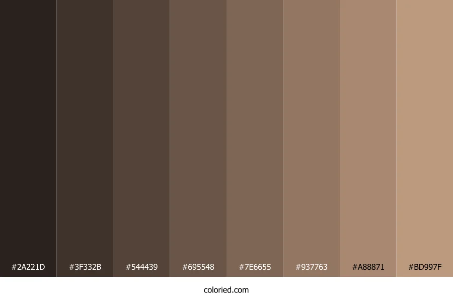 ![]() | #2A221D | 42, 34, 29 | 23, 18%, 14% | 0%, 19%, 31%, 84% | oklch(0.259 0.015 54) |