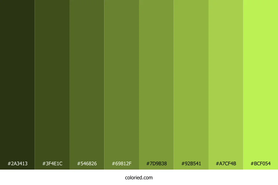 ![]() | #2A3413 | 42, 52, 19 | 78, 46%, 14% | 19%, 0%, 63%, 80% | oklch(0.307 0.054 124) |