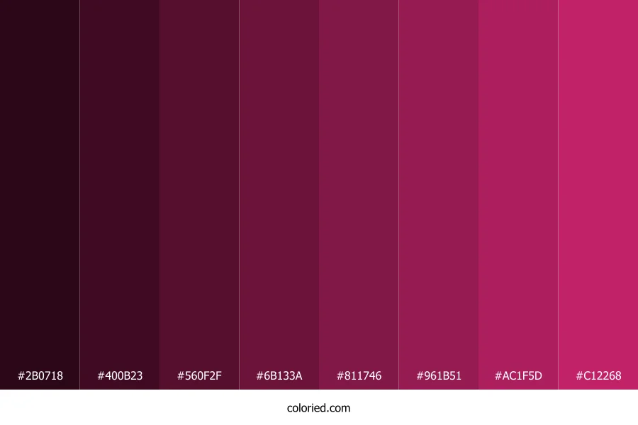 ![]() | #2B0718 | 43, 7, 24 | 332, 72%, 10% | 0%, 84%, 44%, 83% | oklch(0.202 0.063 355) |