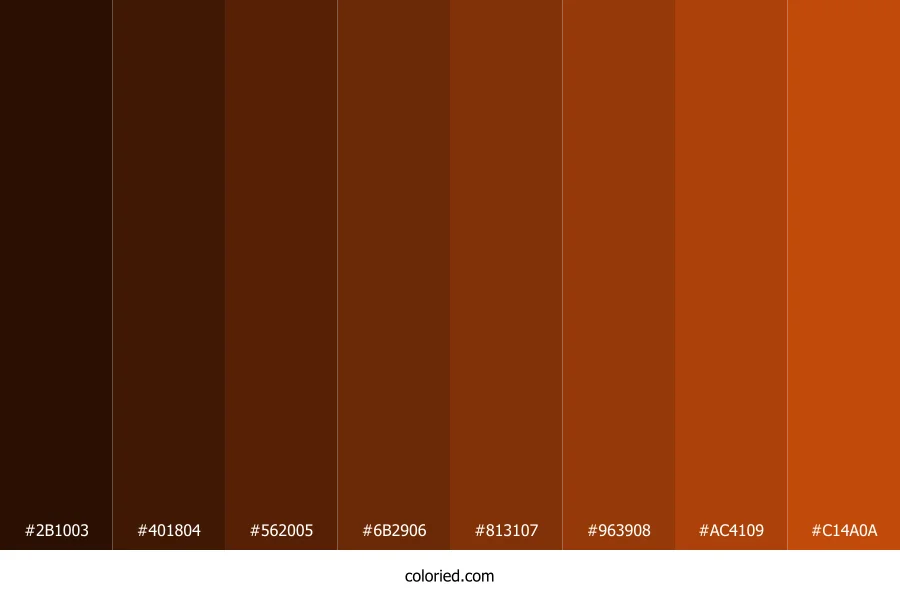 | #6B2906 | 107, 41, 6 | 21, 89%, 22% | 0%, 62%, 94%, 58% | oklch(0.372 0.104 43) | |