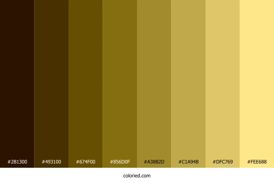 | #856D0F | 133, 109, 15 | 48, 80%, 29% | 0%, 18%, 89%, 48% | oklch(0.543 0.106 93) | |