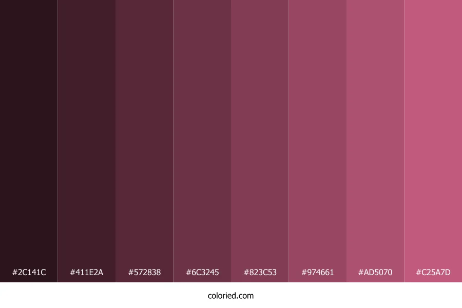![]() | #2C141C | 44, 20, 28 | 340, 38%, 13% | 0%, 55%, 36%, 83% | oklch(0.229 0.041 359) |