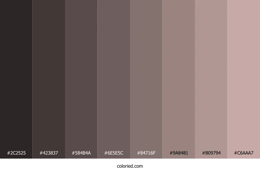 | #9A8481 | 154, 132, 129 | 7, 11%, 55% | 0%, 14%, 16%, 40% | oklch(0.633 0.027 27) | |