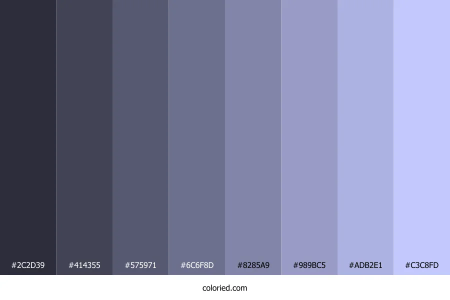 ![]() | #2C2D39 | 44, 45, 57 | 235, 13%, 20% | 23%, 21%, 0%, 78% | oklch(0.301 0.022 281) |