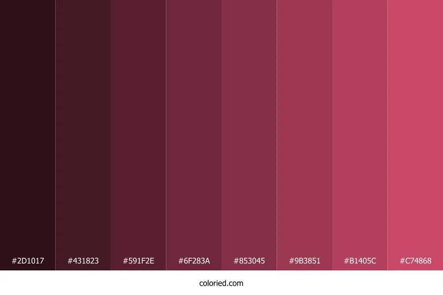 ![]() | #2D1017 | 45, 16, 23 | 346, 48%, 12% | 0%, 64%, 49%, 82% | oklch(0.221 0.048 7) |