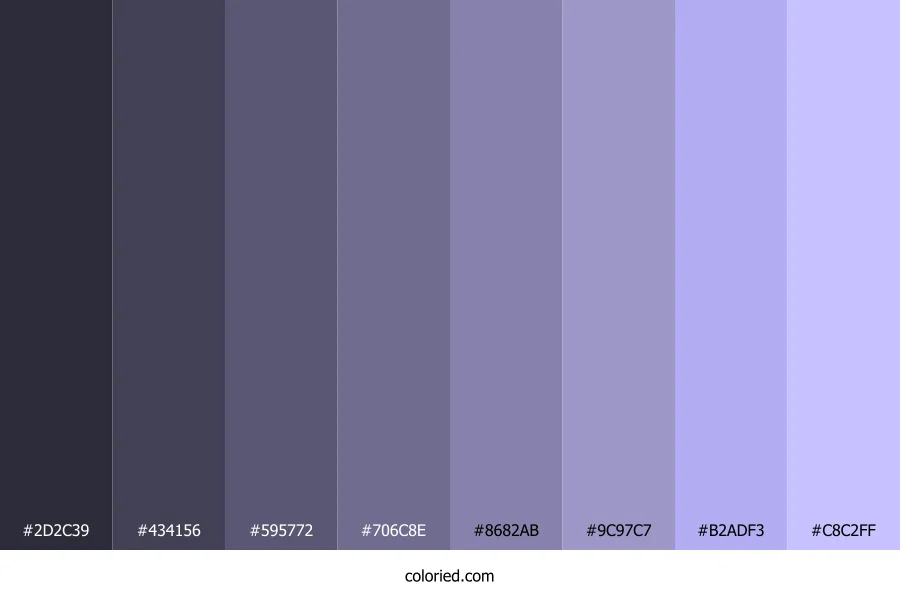 ![]() | #2D2C39 | 45, 44, 57 | 245, 13%, 20% | 21%, 23%, 0%, 78% | oklch(0.300 0.023 288) |