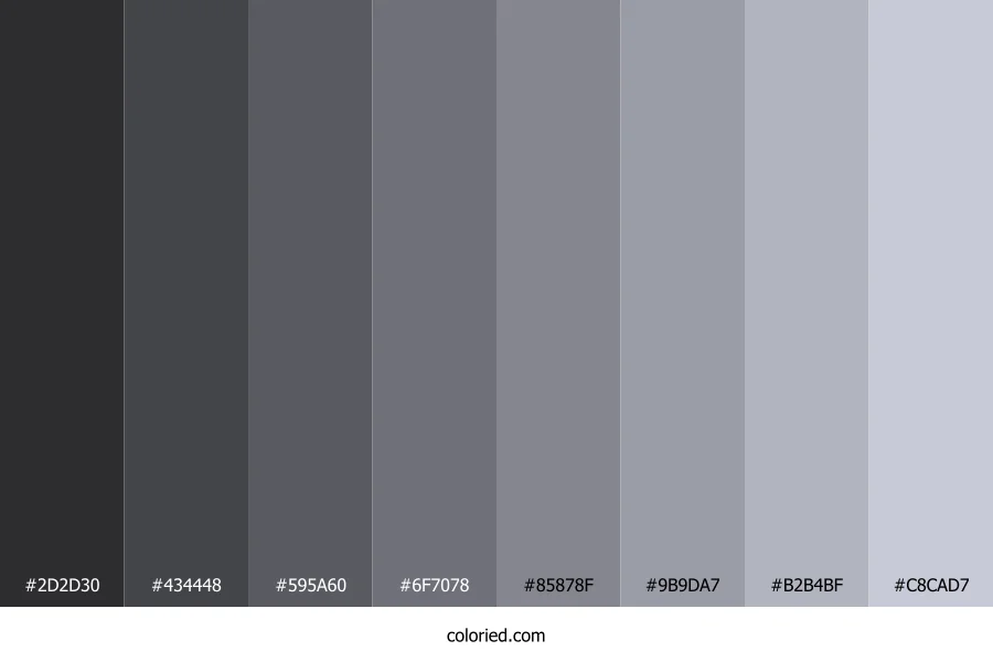 | #85878F | 133, 135, 143 | 228, 4%, 54% | 7%, 6%, 0%, 44% | oklch(0.624 0.012 275) | |
