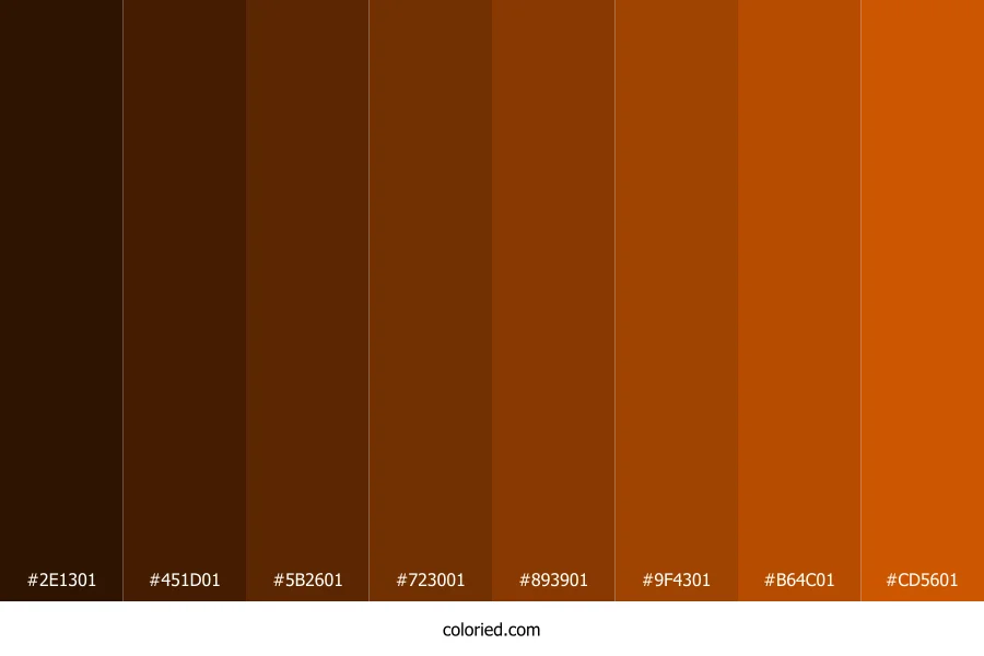 | #5B2601 | 91, 38, 1 | 25, 98%, 18% | 0%, 58%, 99%, 64% | oklch(0.339 0.090 49) | |