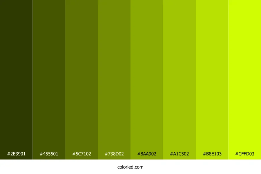 ![]() | #2E3901 | 46, 57, 1 | 72, 97%, 11% | 19%, 0%, 98%, 78% | oklch(0.323 0.077 121) |
