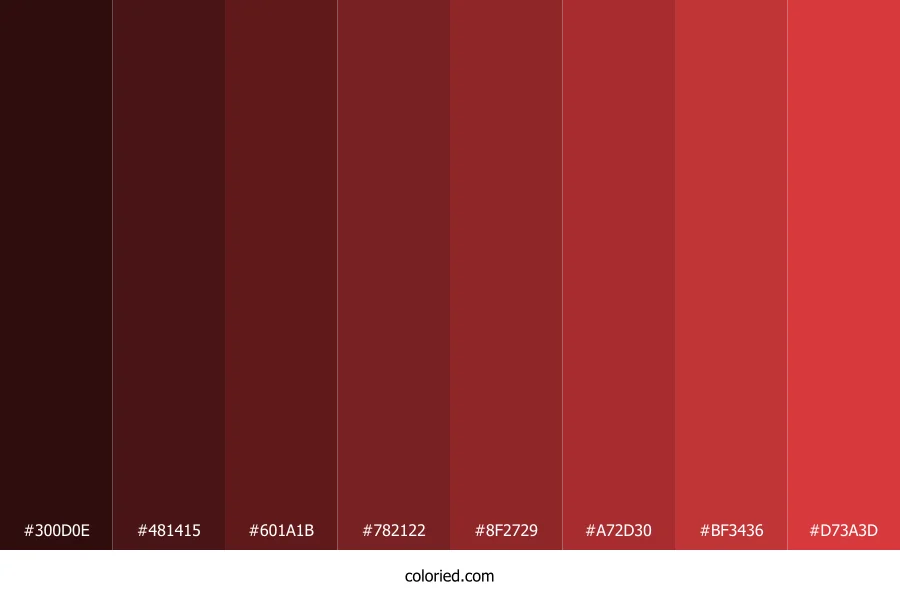 ![]() | #300D0E | 48, 13, 14 | 358, 57%, 12% | 0%, 73%, 71%, 81% | oklch(0.219 0.057 21) |
