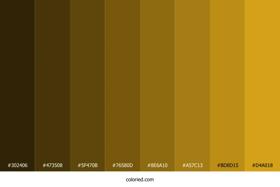 | #A57C13 | 165, 124, 19 | 43, 79%, 36% | 0%, 25%, 88%, 35% | oklch(0.610 0.120 84) | |