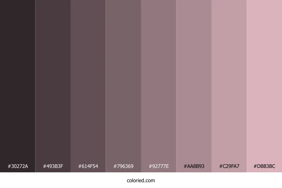 | #493B3F | 73, 59, 63 | 343, 11%, 26% | 0%, 19%, 14%, 71% | oklch(0.369 0.021 359) | |