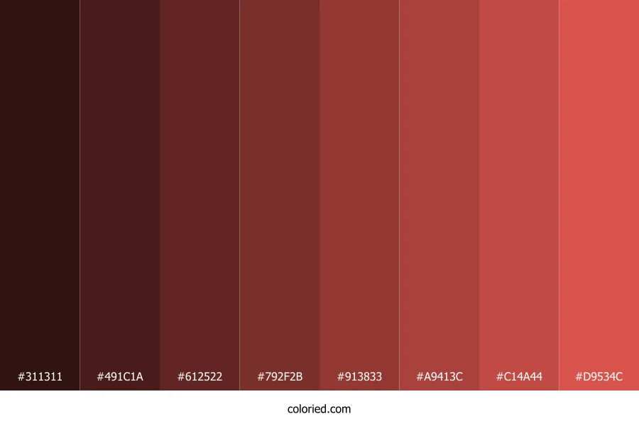| #491C1A | 73, 28, 26 | 3, 47%, 19% | 0%, 62%, 64%, 71% | oklch(0.293 0.069 25) | |
