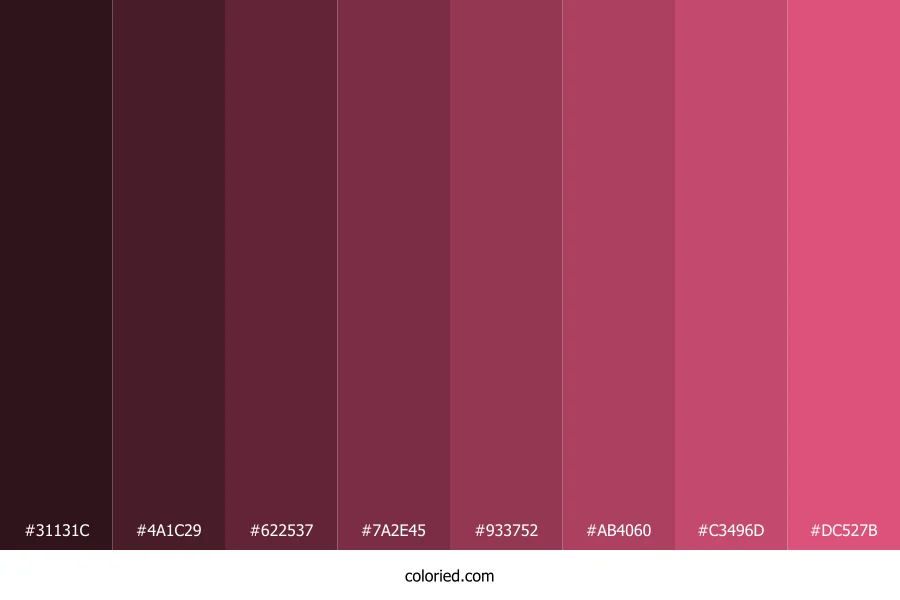 ![]() | #31131C | 49, 19, 28 | 342, 44%, 13% | 0%, 61%, 43%, 81% | oklch(0.236 0.050 3) |