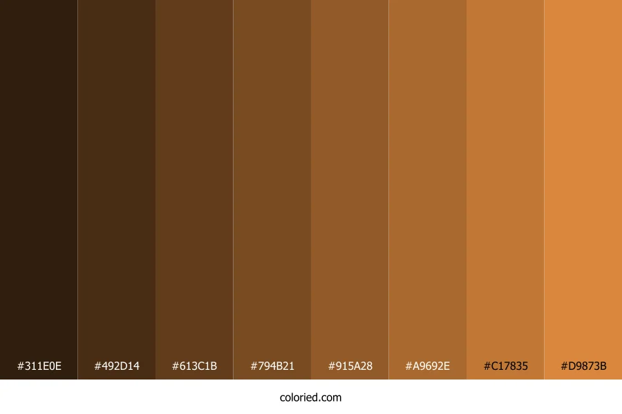 ![]() | #311E0E | 49, 30, 14 | 27, 56%, 12% | 0%, 39%, 71%, 81% | oklch(0.255 0.040 60) |