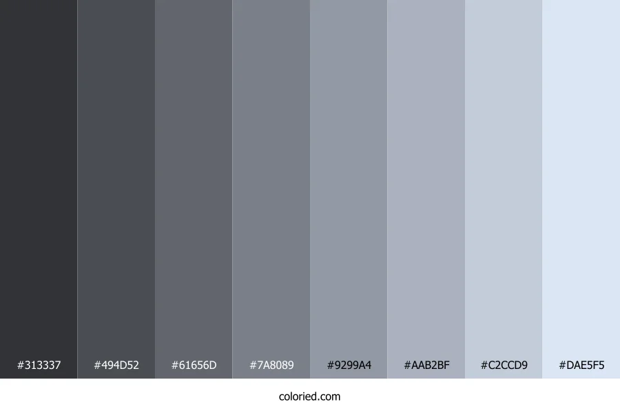 ![]() | #313337 | 49, 51, 55 | 220, 6%, 20% | 11%, 7%, 0%, 78% | oklch(0.321 0.008 264) |