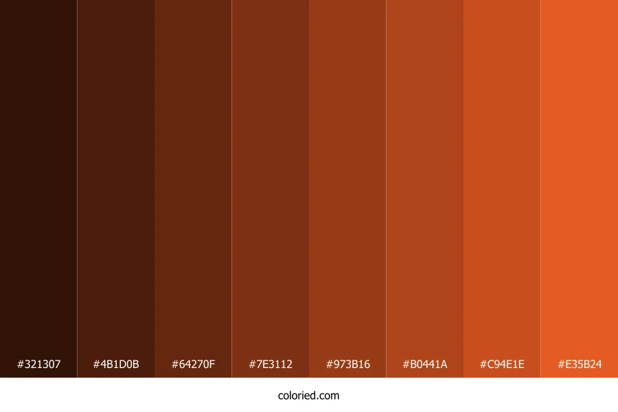 | #7E3112 | 126, 49, 18 | 17, 75%, 28% | 0%, 61%, 86%, 51% | oklch(0.418 0.115 40) | |