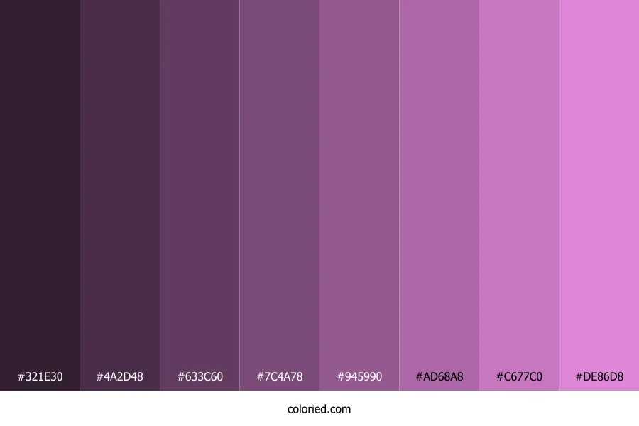 ![]() | #321E30 | 50, 30, 48 | 306, 25%, 16% | 0%, 40%, 4%, 80% | oklch(0.268 0.043 330) |