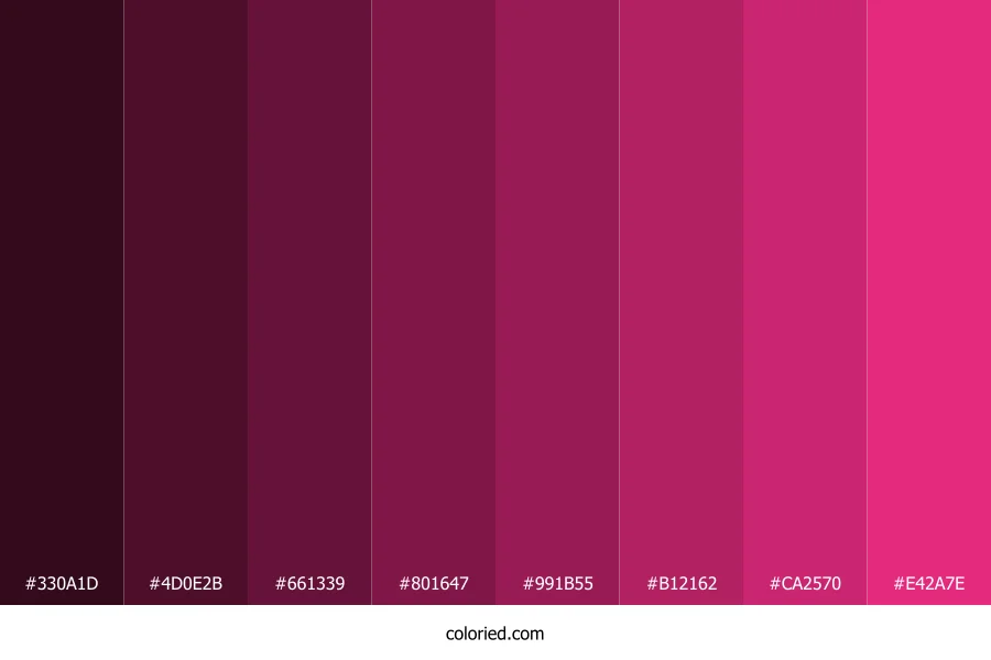 ![]() | #330A1D | 51, 10, 29 | 332, 67%, 12% | 0%, 80%, 43%, 80% | oklch(0.225 0.069 356) |