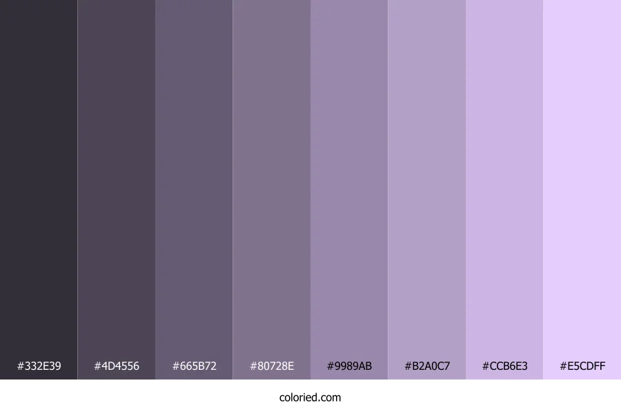 ![]() | #332E39 | 51, 46, 57 | 267, 11%, 20% | 11%, 19%, 0%, 78% | oklch(0.311 0.021 306) |